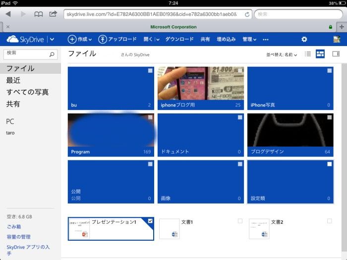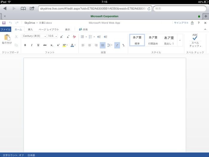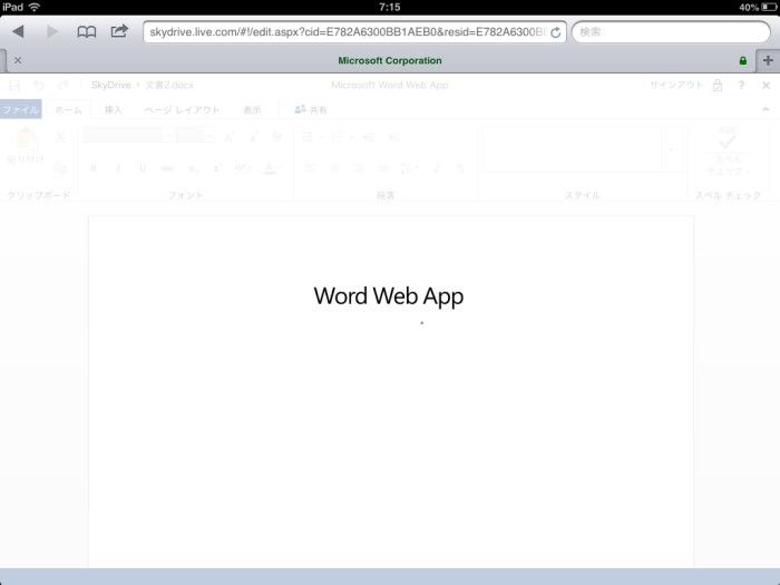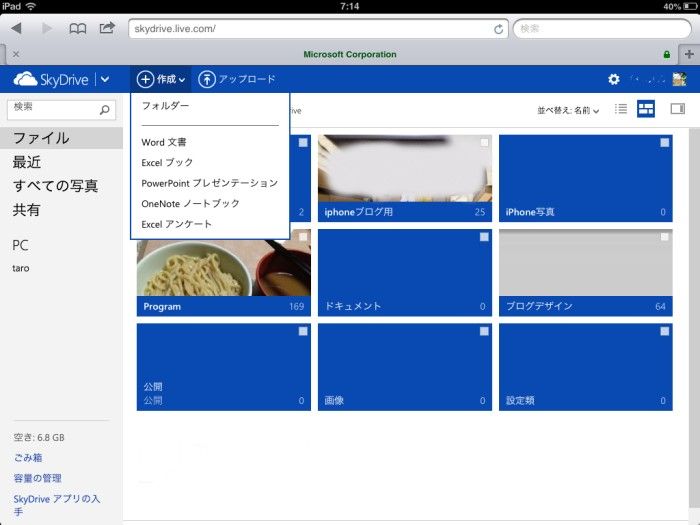 SkyDriveでは、この7GBのスペースにワードやエクセル等Officeファイルを置くと、webアプリでOfficeファイルを編集できる機能を持っています。つまり、パソコンで作っていたWord、Exele、PowerPoint等をSkyDriveに保存しておけば、あなたのiPadやその他タブレット端末で編集が可能なのです。もちろん新規に作成することも可能ですよ^^