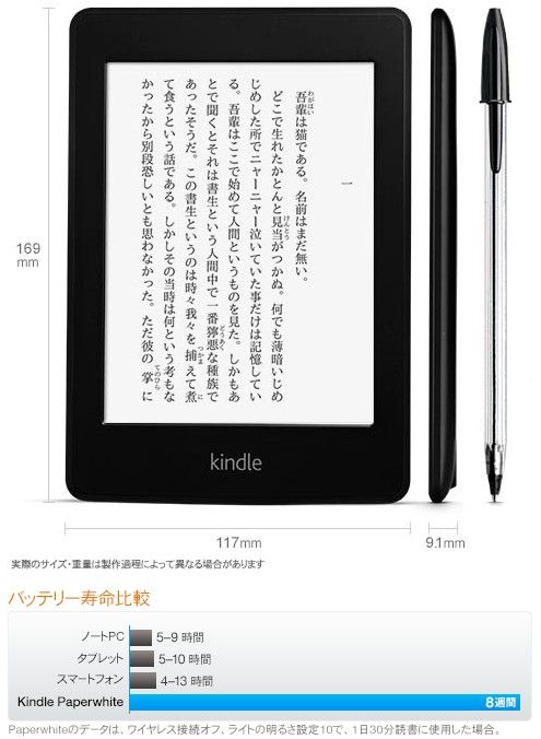 | 同梱内容 | Kindle Paperwhite、USB 2.0充電ケーブル、保証書、スタートガイド |